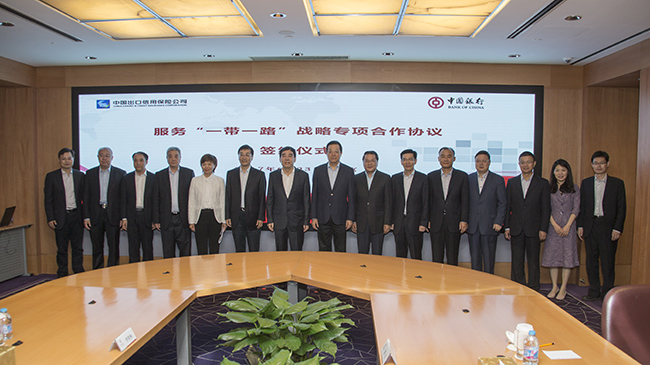 6月23日,中国信保与中国银行在北京签署了《服务“一带一路”战略专项合作协议》。 根据协议,双方将重点加强对“一带一路”沿线重点国别区域的市场开发,大力支持国际产能合作、基础设施建设和资源能源开发以及高新技术服务等领域项目融资,持续开展产品对接与创新、客户和项目资源共享、风险管理等领域业务合作。